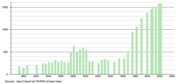 L'évolution du nombre d'habitants est connue à travers les recensements de la population effectués dans la commune depuis 1793. Pour les communes de moins de 10 000 habitants, une enquête de recensement portant sur toute la population est réalisée tous les cinq ans, les populations légales des années intermédiaires étant quant à elles estimées par interpolation ou extrapolation[28]. Pour la commune, le premier recensement exhaustif entrant dans le cadre du nouveau dispositif a été réalisé en 2008[29].
