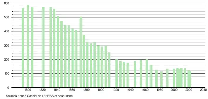 L'évolution du nombre d'habitants est connue à travers les recensements de la population effectués dans la commune depuis 1793. Pour les communes de moins de 10 000 habitants, une enquête de recensement portant sur toute la population est réalisée tous les cinq ans, les populations légales des années intermédiaires étant quant à elles estimées par interpolation ou extrapolation[24]. Pour la commune, le premier recensement exhaustif entrant dans le cadre du nouveau dispositif a été réalisé en 2004[25].