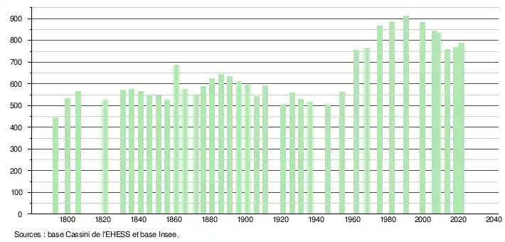L'évolution du nombre d'habitants est connue à travers les recensements de la population effectués dans la commune depuis 1793. Pour les communes de moins de 10 000 habitants, une enquête de recensement portant sur toute la population est réalisée tous les cinq ans, les populations légales des années intermédiaires étant quant à elles estimées par interpolation ou extrapolation[24]. Pour la commune, le premier recensement exhaustif entrant dans le cadre du nouveau dispositif a été réalisé en 2008[25].