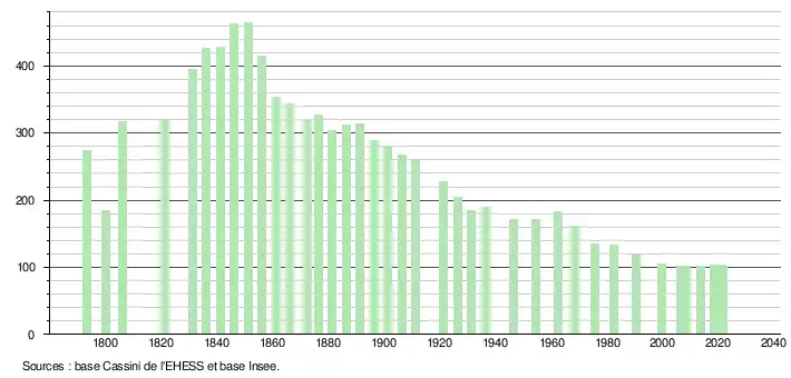 L'évolution du nombre d'habitants est connue à travers les recensements de la population effectués dans la commune depuis 1793. Pour les communes de moins de 10 000 habitants, une enquête de recensement portant sur toute la population est réalisée tous les cinq ans, les populations légales des années intermédiaires étant quant à elles estimées par interpolation ou extrapolation[33]. Pour la commune, le premier recensement exhaustif entrant dans le cadre du nouveau dispositif a été réalisé en 2008[34].
