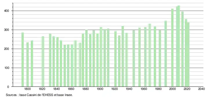 L'évolution du nombre d'habitants est connue à travers les recensements de la population effectués dans la commune depuis 1793. Pour les communes de moins de 10 000 habitants, une enquête de recensement portant sur toute la population est réalisée tous les cinq ans, les populations légales des années intermédiaires étant quant à elles estimées par interpolation ou extrapolation[30]. Pour la commune, le premier recensement exhaustif entrant dans le cadre du nouveau dispositif a été réalisé en 2008[31].