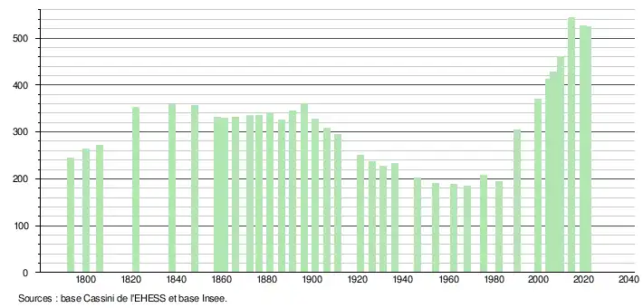 L'évolution du nombre d'habitants est connue à travers les recensements de la population effectués dans la commune depuis 1793. Pour les communes de moins de 10 000 habitants, une enquête de recensement portant sur toute la population est réalisée tous les cinq ans, les populations légales des années intermédiaires étant quant à elles estimées par interpolation ou extrapolation[17]. Pour la commune, le premier recensement exhaustif entrant dans le cadre du nouveau dispositif a été réalisé en 2004[18].
