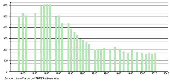 L'évolution du nombre d'habitants est connue à travers les recensements de la population effectués dans la commune depuis 1793. Pour les communes de moins de 10 000 habitants, une enquête de recensement portant sur toute la population est réalisée tous les cinq ans, les populations légales des années intermédiaires étant quant à elles estimées par interpolation ou extrapolation[18]. Pour la commune, le premier recensement exhaustif entrant dans le cadre du nouveau dispositif a été réalisé en 2006[19].