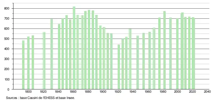 L'évolution du nombre d'habitants est connue à travers les recensements de la population effectués dans la commune depuis 1793. Pour les communes de moins de 10 000 habitants, une enquête de recensement portant sur toute la population est réalisée tous les cinq ans, les populations légales des années intermédiaires étant quant à elles estimées par interpolation ou extrapolation[33]. Pour la commune, le premier recensement exhaustif entrant dans le cadre du nouveau dispositif a été réalisé en 2005[34].