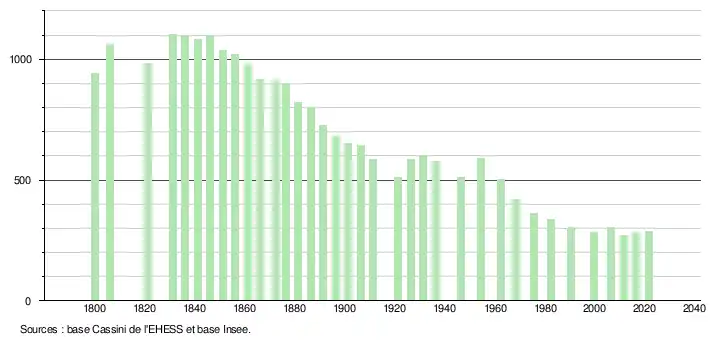 L'évolution du nombre d'habitants est connue à travers les recensements de la population effectués dans la commune depuis 1800. Pour les communes de moins de 10 000 habitants, une enquête de recensement portant sur toute la population est réalisée tous les cinq ans, les populations légales des années intermédiaires étant quant à elles estimées par interpolation ou extrapolation[10]. Pour la commune, le premier recensement exhaustif entrant dans le cadre du nouveau dispositif a été réalisé en 2006[11].