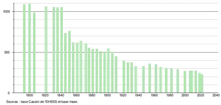 L'évolution du nombre d'habitants est connue à travers les recensements de la population effectués dans la commune depuis 1793. Pour les communes de moins de 10 000 habitants, une enquête de recensement portant sur toute la population est réalisée tous les cinq ans, les populations légales des années intermédiaires étant quant à elles estimées par interpolation ou extrapolation[17]. Pour la commune, le premier recensement exhaustif entrant dans le cadre du nouveau dispositif a été réalisé en 2008[18].