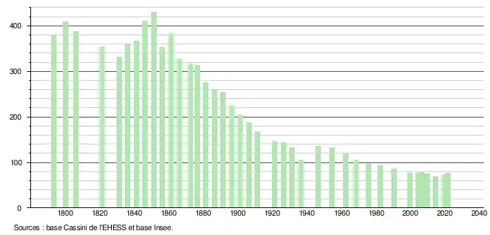 L'évolution du nombre d'habitants est connue à travers les recensements de la population effectués dans la commune depuis 1793. Pour les communes de moins de 10 000 habitants, une enquête de recensement portant sur toute la population est réalisée tous les cinq ans, les populations légales des années intermédiaires étant quant à elles estimées par interpolation ou extrapolation[18]. Pour la commune, le premier recensement exhaustif entrant dans le cadre du nouveau dispositif a été réalisé en 2004[19].