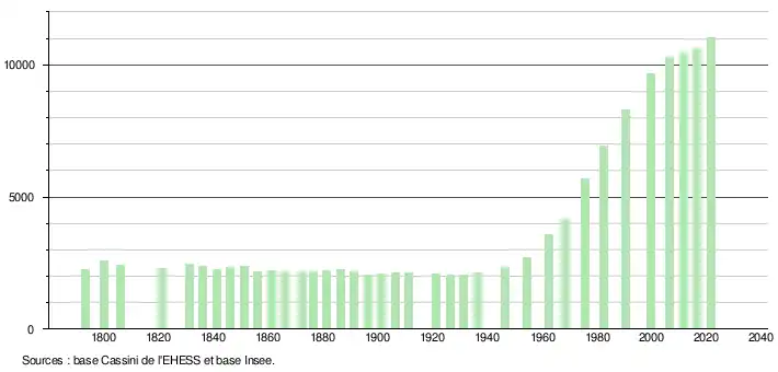 - Par convention dans Wikipédia, le principe a été retenu de n’afficher dans le tableau des recensements et le graphique, pour les populations légales postérieures à 1999, que les populations correspondant à une enquête exhaustive de recensement pour les communes de moins de 10 000 habitants, et que les populations des années 2006, 2011, 2016, etc. pour les communes de plus de 10 000 habitants, ainsi que la dernière population légale publiée par l’Insee pour l'ensemble des communes.