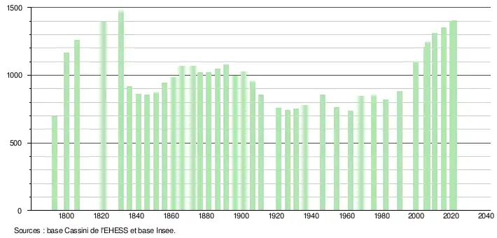 L'évolution du nombre d'habitants est connue à travers les recensements de la population effectués dans la commune depuis 1793. Pour les communes de moins de 10 000 habitants, une enquête de recensement portant sur toute la population est réalisée tous les cinq ans, les populations légales des années intermédiaires étant quant à elles estimées par interpolation ou extrapolation[32]. Pour la commune, le premier recensement exhaustif entrant dans le cadre du nouveau dispositif a été réalisé en 2005[33].