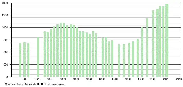 L'évolution du nombre d'habitants est connue à travers les recensements de la population effectués dans la commune depuis 1793. Pour les communes de moins de 10 000 habitants, une enquête de recensement portant sur toute la population est réalisée tous les cinq ans, les populations légales des années intermédiaires étant quant à elles estimées par interpolation ou extrapolation[29]. Pour la commune, le premier recensement exhaustif entrant dans le cadre du nouveau dispositif a été réalisé en 2005[30].