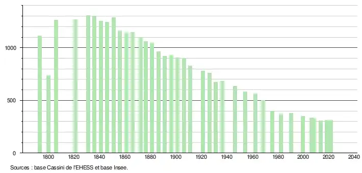 L'évolution du nombre d'habitants est connue à travers les recensements de la population effectués dans la commune depuis 1793. Pour les communes de moins de 10 000 habitants, une enquête de recensement portant sur toute la population est réalisée tous les cinq ans, les populations légales des années intermédiaires étant quant à elles estimées par interpolation ou extrapolation[54]. Pour la commune, le premier recensement exhaustif entrant dans le cadre du nouveau dispositif a été réalisé en 2008[55].