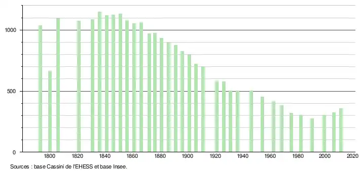 - Dans le tableau des recensements et le graphique, par convention dans Wikipédia, le principe a été retenu, pour les populations légales postérieures à 1999 de n’afficher dans le tableau des recensements et le graphique que les populations correspondant à l'année 2006, première population légale publiée calculée conformément aux concepts définis dans le décret no 2003-485 du 5 juin 2003, et les années correspondant à une enquête exhaustive de recensement pour les communes de moins de 10 000 habitants, ainsi que la dernière population légale publiée par l’Insee.