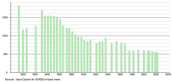 L'évolution du nombre d'habitants est connue à travers les recensements de la population effectués dans la commune depuis 1793. Pour les communes de moins de 10 000 habitants, une enquête de recensement portant sur toute la population est réalisée tous les cinq ans, les populations légales des années intermédiaires étant quant à elles estimées par interpolation ou extrapolation[29]. Pour la commune, le premier recensement exhaustif entrant dans le cadre du nouveau dispositif a été réalisé en 2008[30].