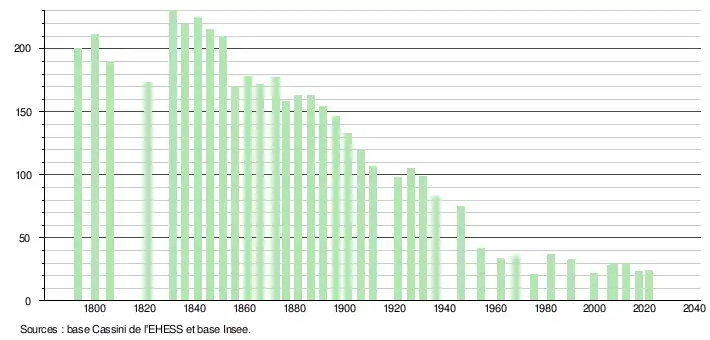 L'évolution du nombre d'habitants est connue à travers les recensements de la population effectués dans la commune depuis 1793. Pour les communes de moins de 10 000 habitants, une enquête de recensement portant sur toute la population est réalisée tous les cinq ans, les populations légales des années intermédiaires étant quant à elles estimées par interpolation ou extrapolation[30]. Pour la commune, le premier recensement exhaustif entrant dans le cadre du nouveau dispositif a été réalisé en 2007[31].