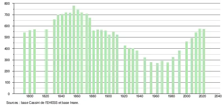 L'évolution du nombre d'habitants est connue à travers les recensements de la population effectués dans la commune depuis 1793. Pour les communes de moins de 10 000 habitants, une enquête de recensement portant sur toute la population est réalisée tous les cinq ans, les populations légales des années intermédiaires étant quant à elles estimées par interpolation ou extrapolation[19]. Pour la commune, le premier recensement exhaustif entrant dans le cadre du nouveau dispositif a été réalisé en 2006[20].