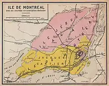 Carte des circonscriptions de l'île de Montréal en 1920. Montréal–Saint-Jacques (identifié St JACQUES sur la carte) est au centre-droit, en jaune.
