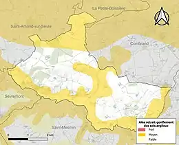 Les mouvements de terrains susceptibles de se produire sur la commune sont des tassements différentiels[17]. Le retrait-gonflement des sols argileux est susceptible d'engendrer des dommages importants aux bâtiments en cas d’alternance de périodes de sécheresse et de pluie[18]. 46,6 % de la superficie communale est en aléa moyen ou fort (54,9 % au niveau départemental et 48,5 % au niveau national)[Carte 2]. Depuis le , en application de la loi ELAN, différentes contraintes s'imposent aux vendeurs, maîtres d'ouvrages ou constructeurs de biens situés dans une zone classée en aléa moyen ou fort[Note 3],[19].