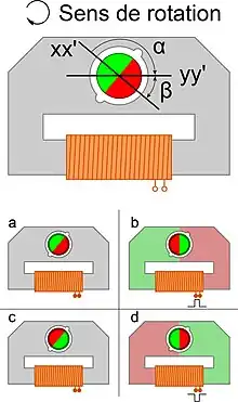 • c) une fois la tension électrique retombée, les alvéoles repositionnent le rotor selon l'angle . Il a fait un demi-tour ;