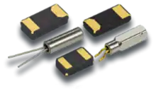 Dans les montres à quartz modernes, le résonateur en quartz a la forme d'un petit diapason, dont la fréquence de résonance est ajustée proche de 32 768 Hz à l'aide d'un laser[8]. Cette fréquence, égale à 215 cycles par seconde, est choisie de telle sorte qu'une chaîne de 15 diviseurs électroniques (bascule T) permet d'atteindre la fréquence de 1 Hz nécessaire au pilotage de l'indication des secondes. Dans les montres, le résonateur est encapsulé dans une cannette métallique ou dans un boîtier céramique. Il est soudé sur le module électronique en même temps que les autres composants électroniques.