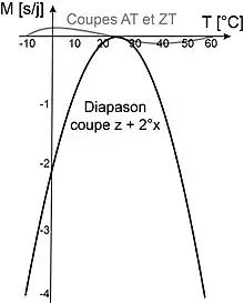 Le diapason en quartz de coupe z + 2°x, utilisé dans la majorité des montres, a une dépendance thermique parabolique ( = -0,035 ppm/°C2 et = 25 °C ), les autres coefficients en température étant quasiment nuls[10]. En se référant au graphique ci-contre de la marche en s/d (1 s/d=11,6 ppm), une montre à quartz a tendance à prendre du retard, que la température augmente ou qu'elle diminue par rapport à 25 °C.