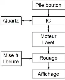Schéma-bloc d'une montre à quartz à affichage mécanique.