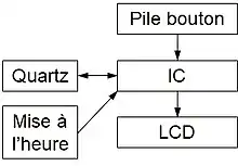 Le schéma bloc d'une montre à quartz est relativement simple. L'énergie provient d'une pile bouton qui alimente le circuit intégré (IC), le quartz et un système d'affichage, lequel utilise soit des éléments mobiles pour une montre à affichage mécanique, soit un écran pour une montre à affichage électronique. L'IC fait osciller le quartz à une fréquence précise et stable, ce qui constitue la base de temps. Dans le cas d'une montre à affichage mécanique, l'IC envoie des impulsions à intervalles réguliers à un moteur pas-à-pas qui fait tourner un rouage auquel sont fixées des aiguilles ou des disques, qui indiquent les heures, les minutes et souvent les secondes.