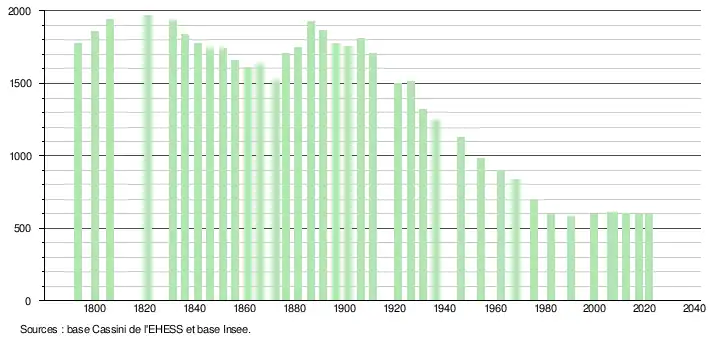 L'évolution du nombre d'habitants est connue à travers les recensements de la population effectués dans la commune depuis 1793. Pour les communes de moins de 10 000 habitants, une enquête de recensement portant sur toute la population est réalisée tous les cinq ans, les populations légales des années intermédiaires étant quant à elles estimées par interpolation ou extrapolation[19]. Pour la commune, le premier recensement exhaustif entrant dans le cadre du nouveau dispositif a été réalisé en 2007[20].