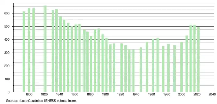 L'évolution du nombre d'habitants est connue à travers les recensements de la population effectués dans la commune depuis 1793. Pour les communes de moins de 10 000 habitants, une enquête de recensement portant sur toute la population est réalisée tous les cinq ans, les populations légales des années intermédiaires étant quant à elles estimées par interpolation ou extrapolation[17]. Pour la commune, le premier recensement exhaustif entrant dans le cadre du nouveau dispositif a été réalisé en 2006[18].