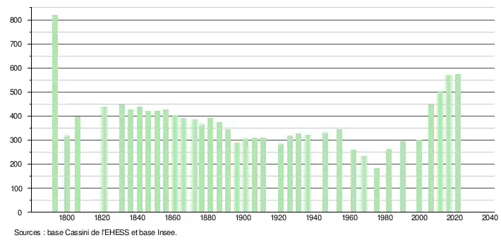 L'évolution du nombre d'habitants est connue à travers les recensements de la population effectués dans la commune depuis 1793. Pour les communes de moins de 10 000 habitants, une enquête de recensement portant sur toute la population est réalisée tous les cinq ans, les populations légales des années intermédiaires étant quant à elles estimées par interpolation ou extrapolation[21]. Pour la commune, le premier recensement exhaustif entrant dans le cadre du nouveau dispositif a été réalisé en 2006[22].