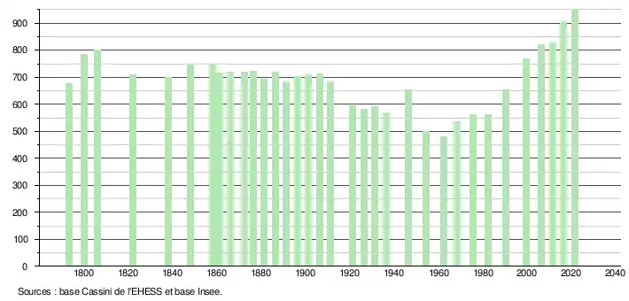 L'évolution du nombre d'habitants est connue à travers les recensements de la population effectués dans la commune depuis 1793. Pour les communes de moins de 10 000 habitants, une enquête de recensement portant sur toute la population est réalisée tous les cinq ans, les populations légales des années intermédiaires étant quant à elles estimées par interpolation ou extrapolation[24]. Pour la commune, le premier recensement exhaustif entrant dans le cadre du nouveau dispositif a été réalisé en 2006[25].