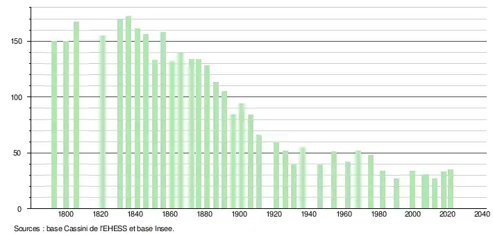L'évolution du nombre d'habitants est connue à travers les recensements de la population effectués dans la commune depuis 1793. Pour les communes de moins de 10 000 habitants, une enquête de recensement portant sur toute la population est réalisée tous les cinq ans, les populations légales des années intermédiaires étant quant à elles estimées par interpolation ou extrapolation[38]. Pour la commune, le premier recensement exhaustif entrant dans le cadre du nouveau dispositif a été réalisé en 2007[39].