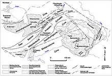 - Orlasenke au versant nord-est de la pénéplaine en direction des grès bigarrés (plaines gréseuses de Saale-Elster) du bassin de Thuringe