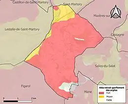 Le retrait-gonflement des sols argileux est susceptible d'engendrer des dommages importants aux bâtiments en cas d’alternance de périodes de sécheresse et de pluie. 97,1 % de la superficie communale est en aléa moyen ou fort (88,8 % au niveau départemental et 48,5 % au niveau national). Sur les 219 bâtiments dénombrés sur la commune en 2019, 219 sont en aléa moyen ou fort, soit 100 %, à comparer aux 98 % au niveau départemental et 54 % au niveau national. Une cartographie de l'exposition du territoire national au retrait gonflement des sols argileux est disponible sur le site du BRGM[34],[Carte 3].