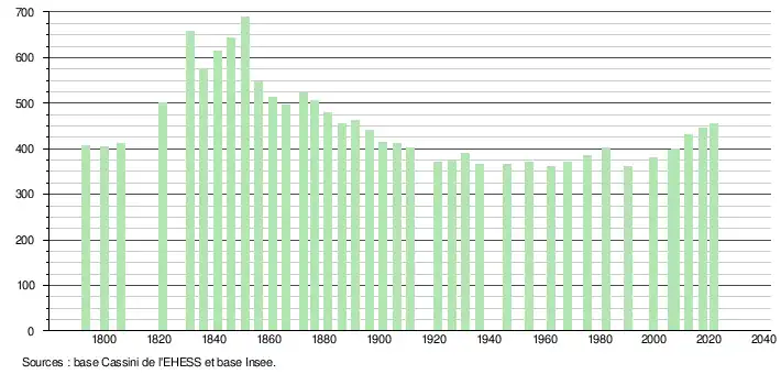 L'évolution du nombre d'habitants est connue à travers les recensements de la population effectués dans la commune depuis 1793. Pour les communes de moins de 10 000 habitants, une enquête de recensement portant sur toute la population est réalisée tous les cinq ans, les populations légales des années intermédiaires étant quant à elles estimées par interpolation ou extrapolation[37]. Pour la commune, le premier recensement exhaustif entrant dans le cadre du nouveau dispositif a été réalisé en 2007[38].