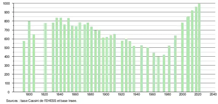 L'évolution du nombre d'habitants est connue à travers les recensements de la population effectués dans la commune depuis 1793. Pour les communes de moins de 10 000 habitants, une enquête de recensement portant sur toute la population est réalisée tous les cinq ans, les populations légales des années intermédiaires étant quant à elles estimées par interpolation ou extrapolation[14]. Pour la commune, le premier recensement exhaustif entrant dans le cadre du nouveau dispositif a été réalisé en 2007[15].