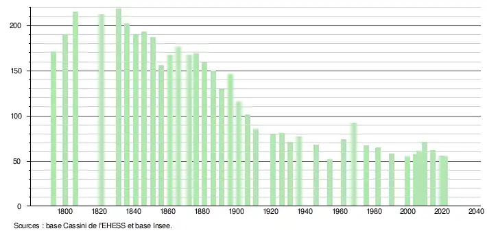 L'évolution du nombre d'habitants est connue à travers les recensements de la population effectués dans la commune depuis 1793. Pour les communes de moins de 10 000 habitants, une enquête de recensement portant sur toute la population est réalisée tous les cinq ans, les populations légales des années intermédiaires étant quant à elles estimées par interpolation ou extrapolation[17]. Pour la commune, le premier recensement exhaustif entrant dans le cadre du nouveau dispositif a été réalisé en 2004[18].