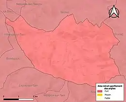 La commune est vulnérable au risque de mouvements de terrains constitué principalement du retrait-gonflement des sols argileux[25]. Cet aléa est susceptible d'engendrer des dommages importants aux bâtiments en cas d’alternance de périodes de sécheresse et de pluie. La totalité de la commune est en aléa moyen ou fort (76,3 % au niveau départemental et 48,5 % au niveau national). Sur les 111 bâtiments dénombrés sur la commune en 2019, 111 sont en aléa moyen ou fort, soit 100 %, à comparer aux 90 % au niveau départemental et 54 % au niveau national. Une cartographie de l'exposition du territoire national au retrait gonflement des sols argileux est disponible sur le site du BRGM[26],[Carte 3].