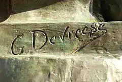 La statue en bronze porte, sur le côté gauche, la signature de Godefroid Devreese et, à droite, la mention « Fonderie Nationale des Bronzes - Ancienne firme J. Petermann - St Gilles - Bruxelles ».