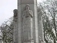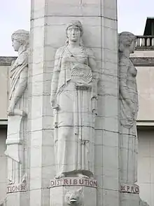 - Au-dessus de cette dernière s’élève un large pilier tétragonal sur lequel sont sculptées quatre figures féminines, allégories des quatre principaux services dispensés par les « Services of Supply » : Procurement, Construction, Administration et Distribution.