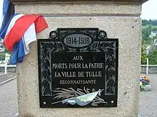 - celle dont on est sûr, porte la légende suivante en lettres capitales : « 1914-1918 / AUX / MORTS POUR LA PATRIE / LA VILLE DE TULLE / RECONNAISSANTE »). Elle est d’ailleurs visible sur la photo de René Fourgeaud conservée aux Archives départementales de la Coirrèze ;