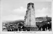 À Tulle, le premier monument aux morts conçu en tant que tel se trouve être un cénotaphe conçu par l’architecte de la ville, Joseph Auberty[14]. Il a été érigé, en vue de la « fête de retour du 100e Régiment d’Infanterie » qui s’est déroulée les 20 et . Il se situait à côté d’un bâtiment de l’Ancien Collège, sur la place du même nom appelée aussi « place de la Poste »