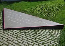Il s'agit d'un triangle de granit rose de 120 cm de côté. Sa forme et sa couleur font référence au système de marquage des prisonniers dans les camps nazis.