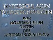 En 1992, l'ancien camp de concentration de Sachsenhausen (Brandebourg, Allemagne) inaugure une plaque commémorative portant l'inscription : « Totgeschlagen Totgeschwiegen Den homosexuellen Opfern des Nationalsozialismus ».