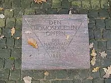 Depuis 2007, dans différentes villes européennes, à l'initiative de l'artiste Gunter Demninga, des « pierres d'achoppement », petits pavés en métal, sont posées devant le dernier domicile de personnes mortes pour cause d'homosexualité sous le régime nazi.