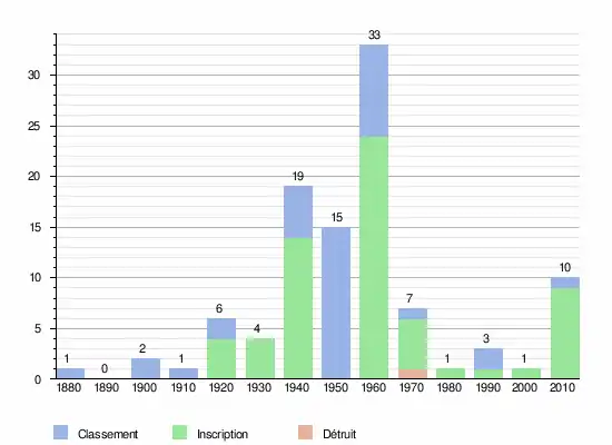 Le graphique suivant résume la chronologie des 94 actes de protection par décennies depuis 1880 :