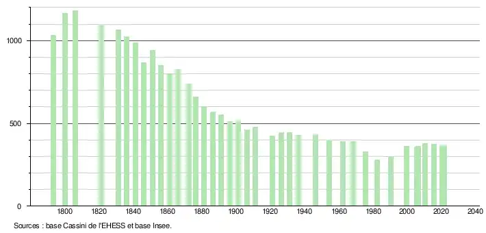 L'évolution du nombre d'habitants est connue à travers les recensements de la population effectués dans la commune depuis 1793. Pour les communes de moins de 10 000 habitants, une enquête de recensement portant sur toute la population est réalisée tous les cinq ans, les populations légales des années intermédiaires étant quant à elles estimées par interpolation ou extrapolation[30]. Pour la commune, le premier recensement exhaustif entrant dans le cadre du nouveau dispositif a été réalisé en 2005[31].