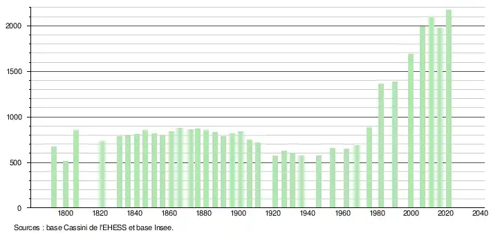 L'évolution du nombre d'habitants est connue à travers les recensements de la population effectués dans la commune depuis 1793. Pour les communes de moins de 10 000 habitants, une enquête de recensement portant sur toute la population est réalisée tous les cinq ans, les populations légales des années intermédiaires étant quant à elles estimées par interpolation ou extrapolation[16]. Pour la commune, le premier recensement exhaustif entrant dans le cadre du nouveau dispositif a été réalisé en 2006[17].