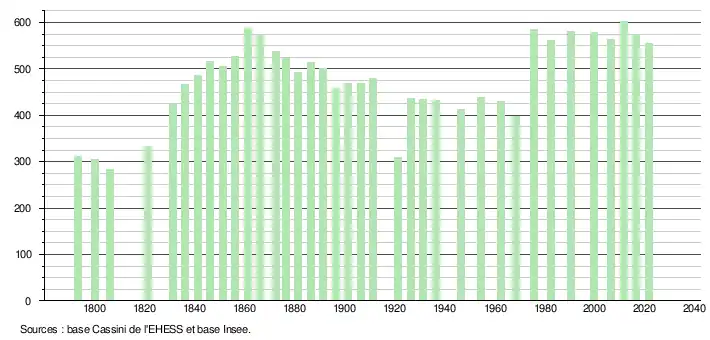 L'évolution du nombre d'habitants est connue à travers les recensements de la population effectués dans la commune depuis 1793. Pour les communes de moins de 10 000 habitants, une enquête de recensement portant sur toute la population est réalisée tous les cinq ans, les populations légales des années intermédiaires étant quant à elles estimées par interpolation ou extrapolation[34]. Pour la commune, le premier recensement exhaustif entrant dans le cadre du nouveau dispositif a été réalisé en 2006[35].