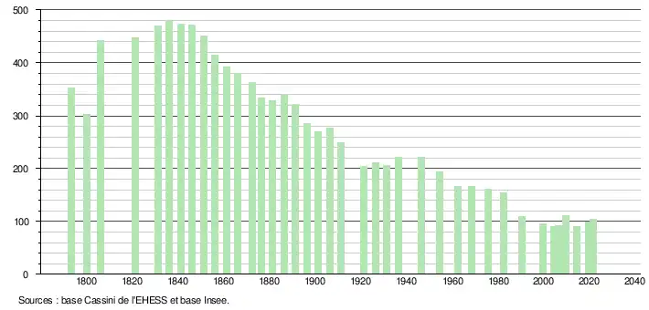 L'évolution du nombre d'habitants est connue à travers les recensements de la population effectués dans la commune depuis 1793. Pour les communes de moins de 10 000 habitants, une enquête de recensement portant sur toute la population est réalisée tous les cinq ans, les populations légales des années intermédiaires étant quant à elles estimées par interpolation ou extrapolation[23]. Pour la commune, le premier recensement exhaustif entrant dans le cadre du nouveau dispositif a été réalisé en 2004[24].