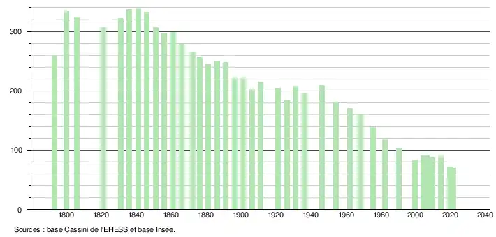 L'évolution du nombre d'habitants est connue à travers les recensements de la population effectués dans la commune depuis 1793. Pour les communes de moins de 10 000 habitants, une enquête de recensement portant sur toute la population est réalisée tous les cinq ans, les populations légales des années intermédiaires étant quant à elles estimées par interpolation ou extrapolation[34]. Pour la commune, le premier recensement exhaustif entrant dans le cadre du nouveau dispositif a été réalisé en 2004[35].